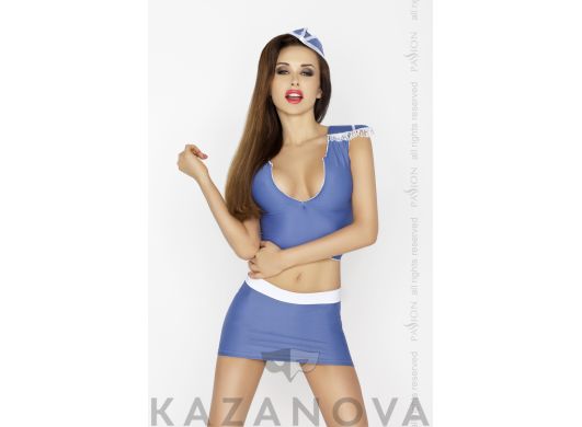 Облегающая сорочка нежного цвета с голубым кантом и бантиками плотно прилегает к телу и подчеркивает соблазнительные формы. Сексуальный вырез на ягодицах возбуждает жаркие фантазии, а миниатюрные стринги вызывают немедленное желание их снять. Пилотка в тон завершает образ и придает желанную игривость.
