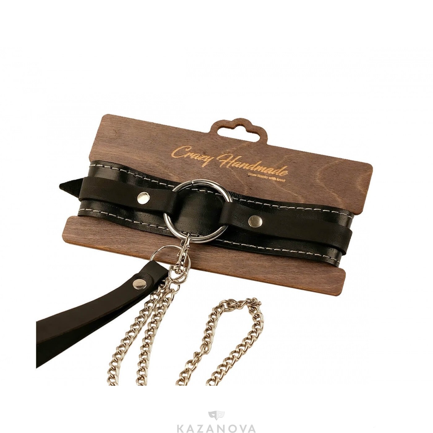 Ошейник Crazy Handmade из натуральной кожи чёрный с кольцом и поводком на цепочке