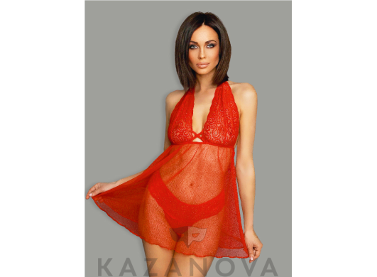 Пеньюар с завышенной талией сделан из полупрозрачной ткани. Лиф пеньюара завязывается на шее и оставляет открытую спину. Кружевная отделка зоны декольте привлекает внимание к груди. В комплект входят кружевные трусики.